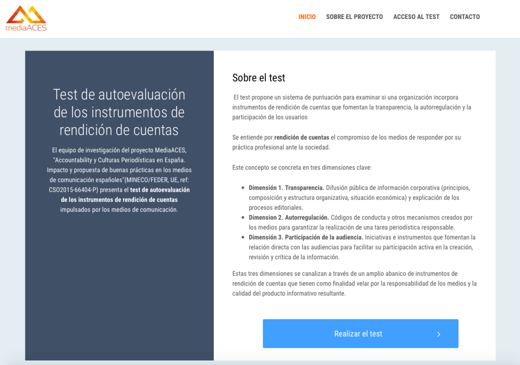 El equipo de investigación del proyecto MediaACES presenta el test de autoevaluación de los instrumentos de rendición de cuentas impulsados por los medios de comunicación. La plataforma plantea varias preguntas y propone un sistema de puntuación para determinar si un medio presenta una escasa orientación a la rendición de cuentas (0–5 puntos), favorece la rendición de cuentas (6–10 puntos) o fomenta activamente la rendición de cuentas (11–15 puntos). Desde el ámbito profesional, esta herramienta open access puede ayudar a la introducción o rediseño de instrumentos de accountability en aras de mejorar la transparencia, autorregulación y participación de los usuarios. Desde el ámbito académico, esta plataforma también puede contribuir a fomentar los análisis de los medios de comunicación. Acceder al test